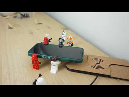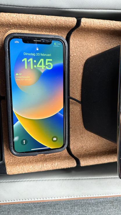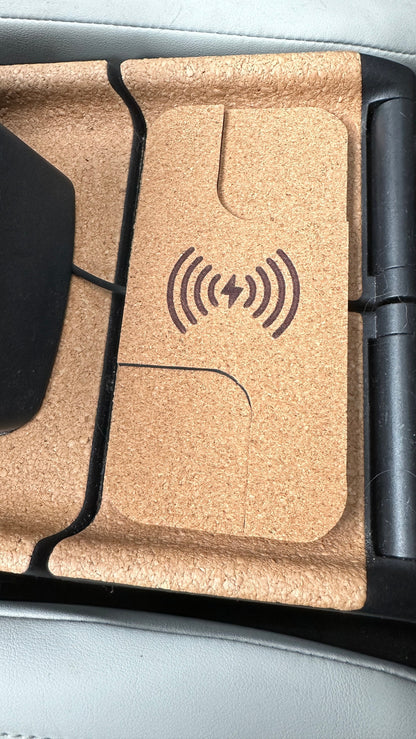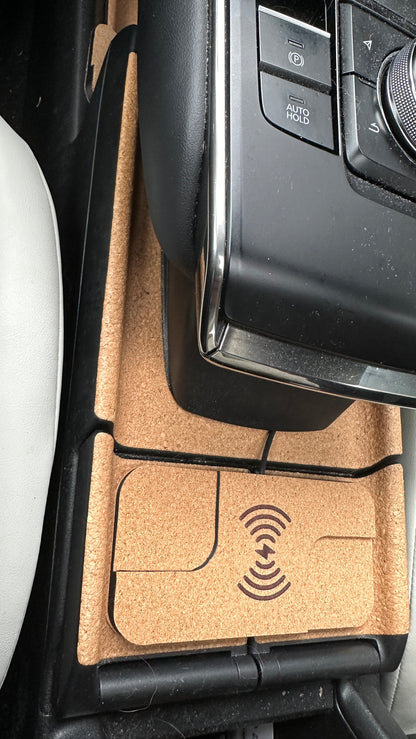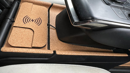 Een design draadloze telefoonoplader gelamineerd met kurk, passend bij het ontwerp van de Mazda Mx30 middenconsole.